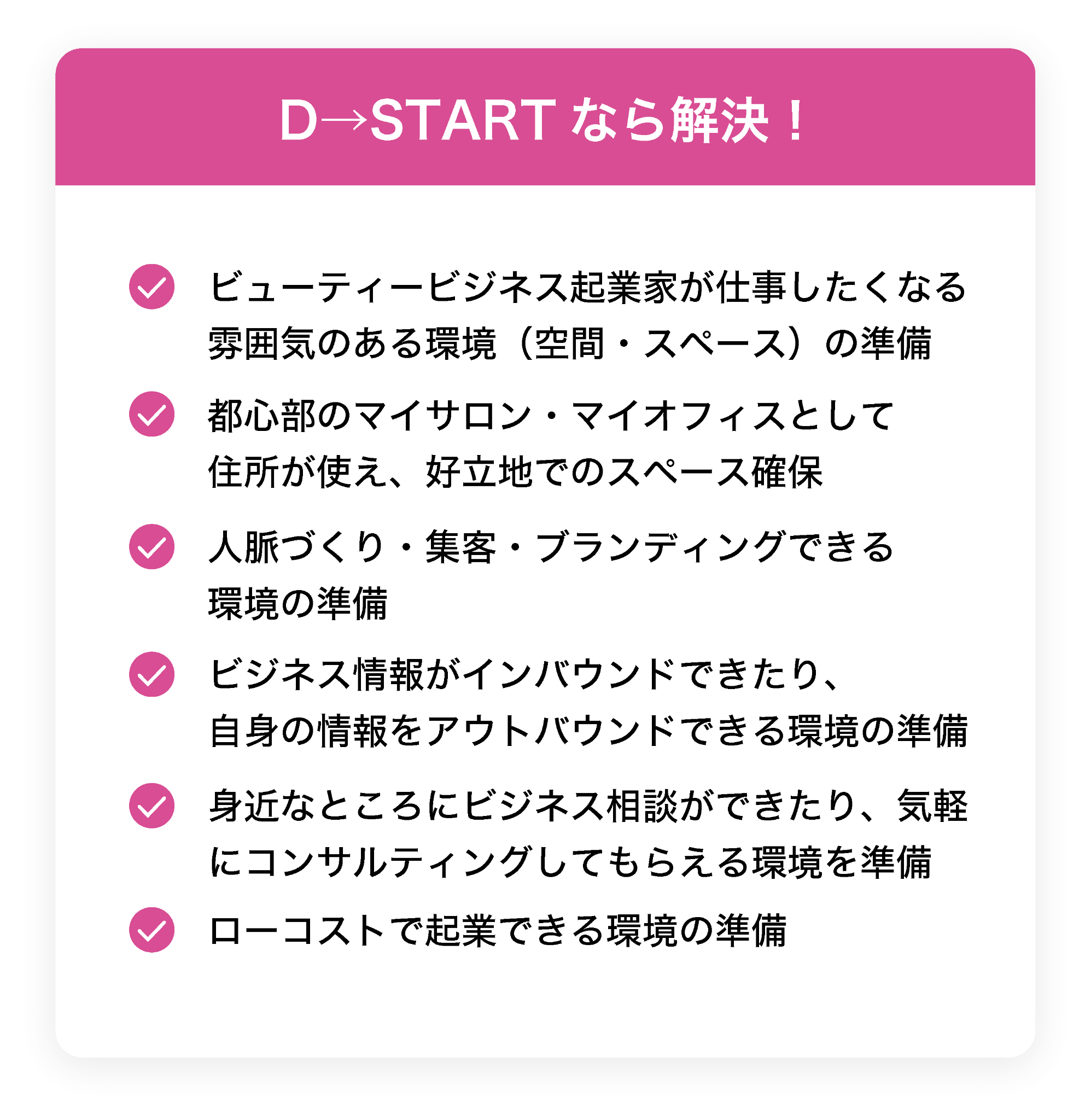 「beautybizsalon D→START」は、ビューティービジネスを通じ、夢を実現させたい人はもちろん、どんなビジネスの方でも即ACTIONを起こせる「空間」「コミュニティー」「コンサルティング」を提供します。