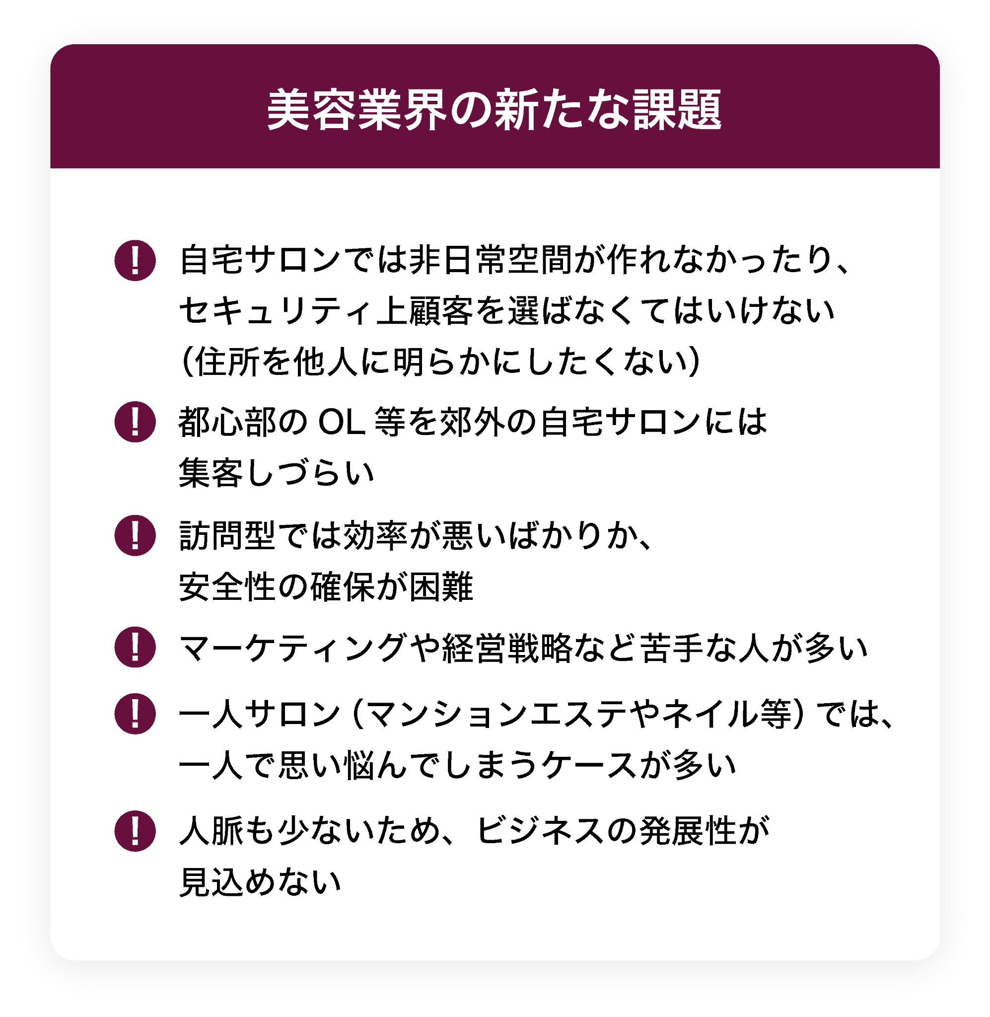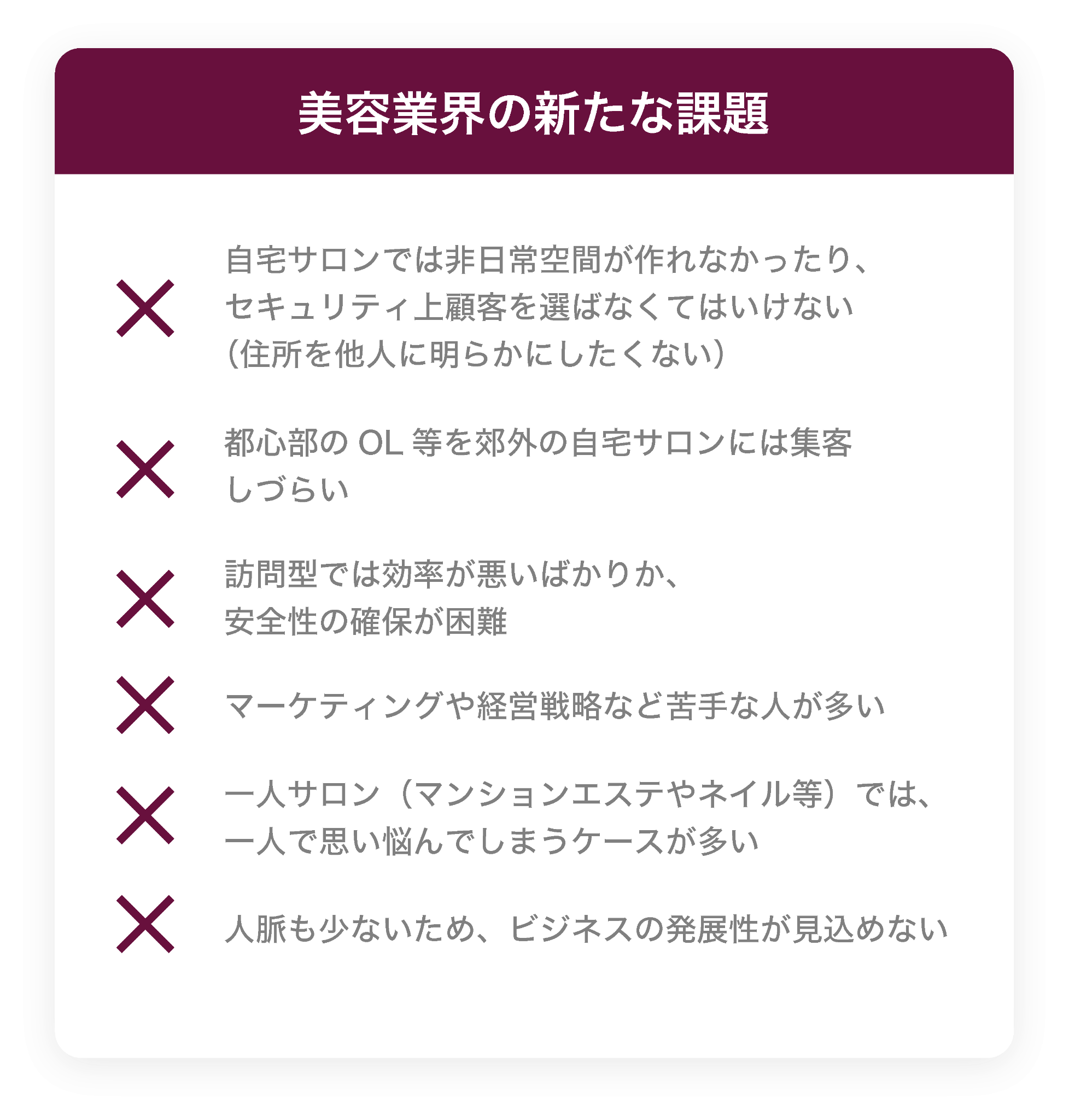 自宅サロンでは非日常空間が作れなかったり、セキュリティ上顧客を選ばなくてはいけない(住所を他人に明らかにしたくない)