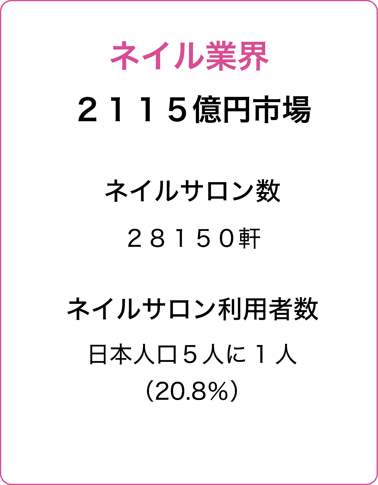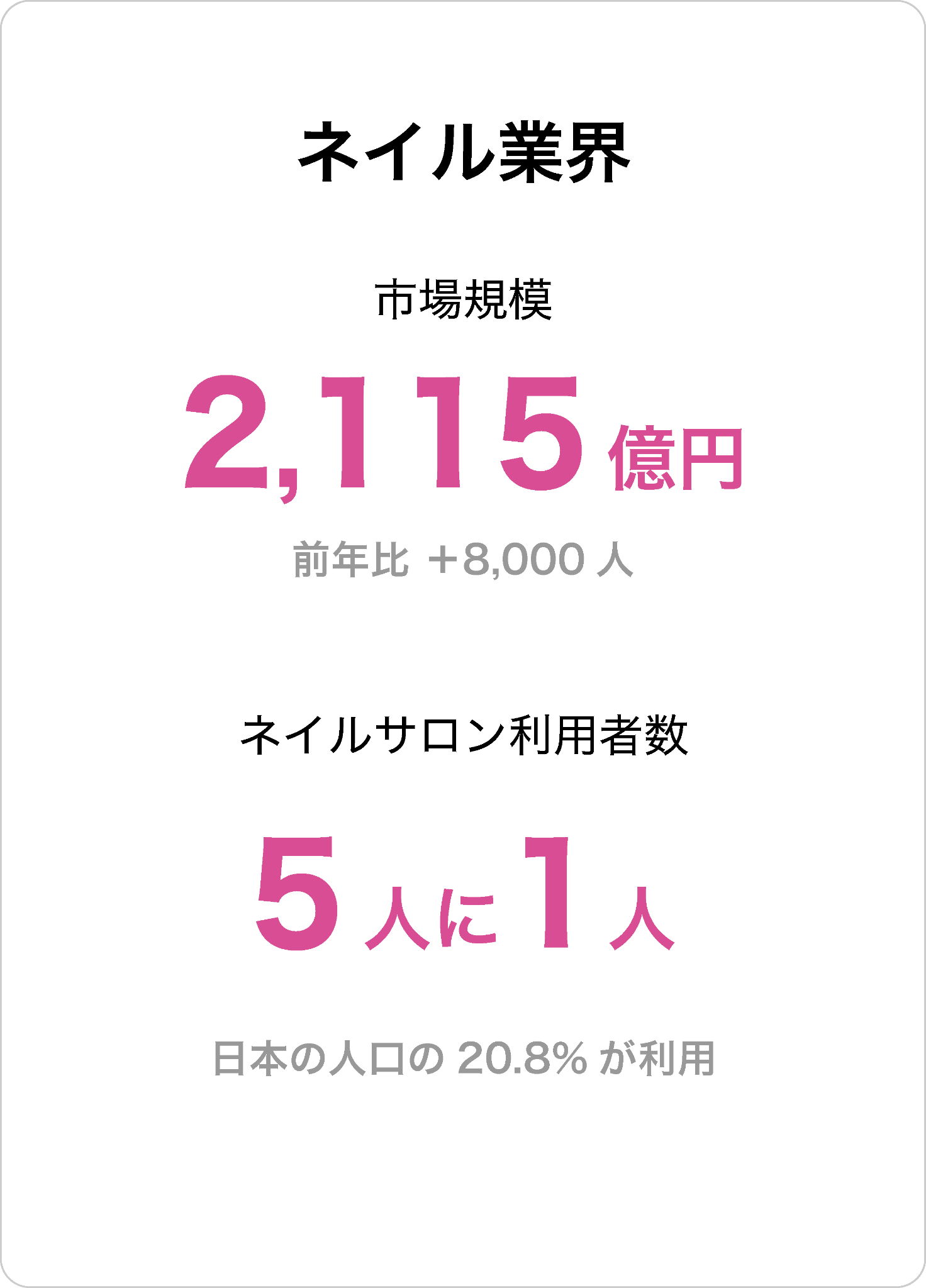 ・ネイル業界は国内5人に1人の利用率で市場が伸び、エステ・美容師を追随している。顧客が個人に